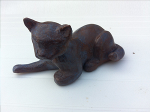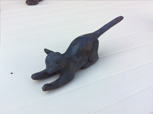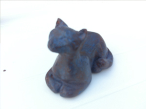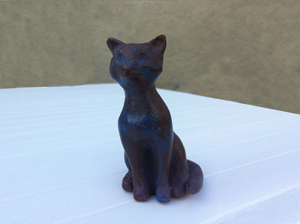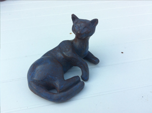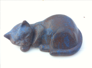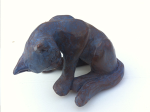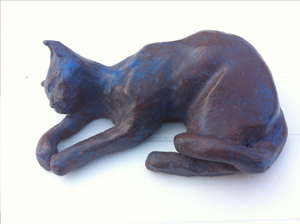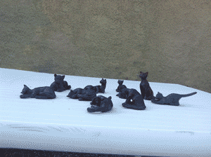Série de chats en terre cuite taille environ 10 cm, dans différentes positions, patinée bronze bleu.